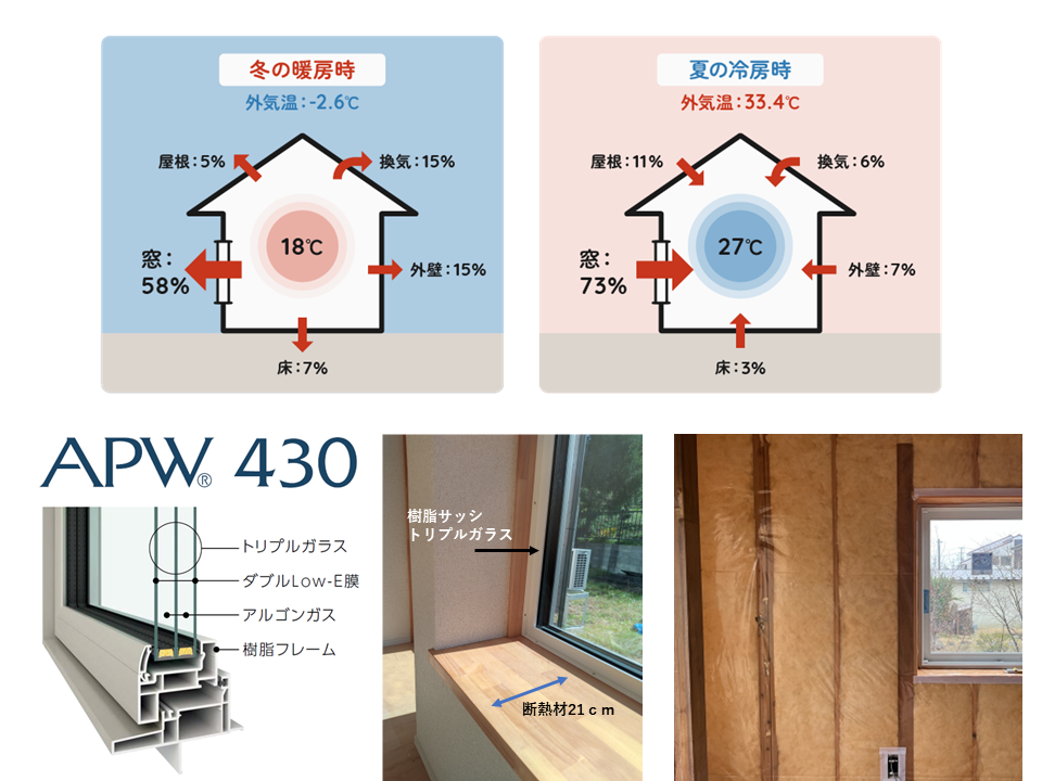 断熱性能を高める最大のポイントは窓部分にあります。すべての窓をハイスペックの戸建住宅に用いられ始めた高性能なトリプルガラス樹脂窓(APW430)とし、断熱性と気密性を高めました。
