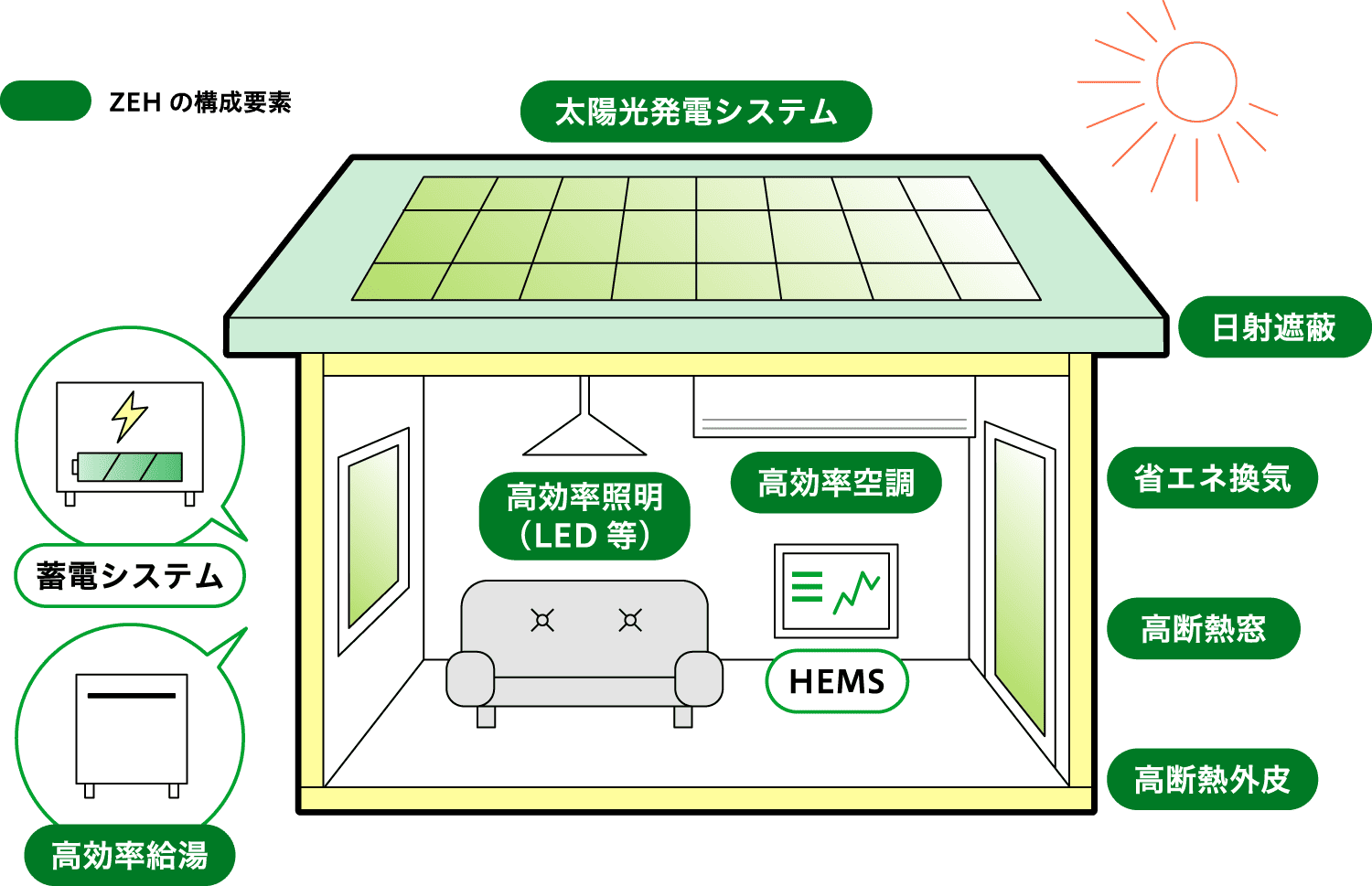 「ZEH(ゼッチ)」とは、Net Zero Energy House(ネット・ゼロ・エネルギー・ハウス)の略語で、「エネルギー収支をゼロ以下にする家」の総称になります。