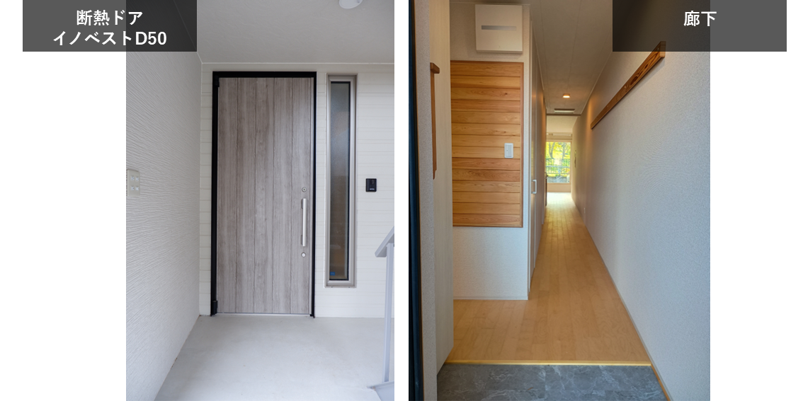 外壁や境界壁、床下などには防音性も考慮して断熱吸音ウールと遮音ボードを施工し、高断熱玄関ドア(イノベストD50)を採用しています。
